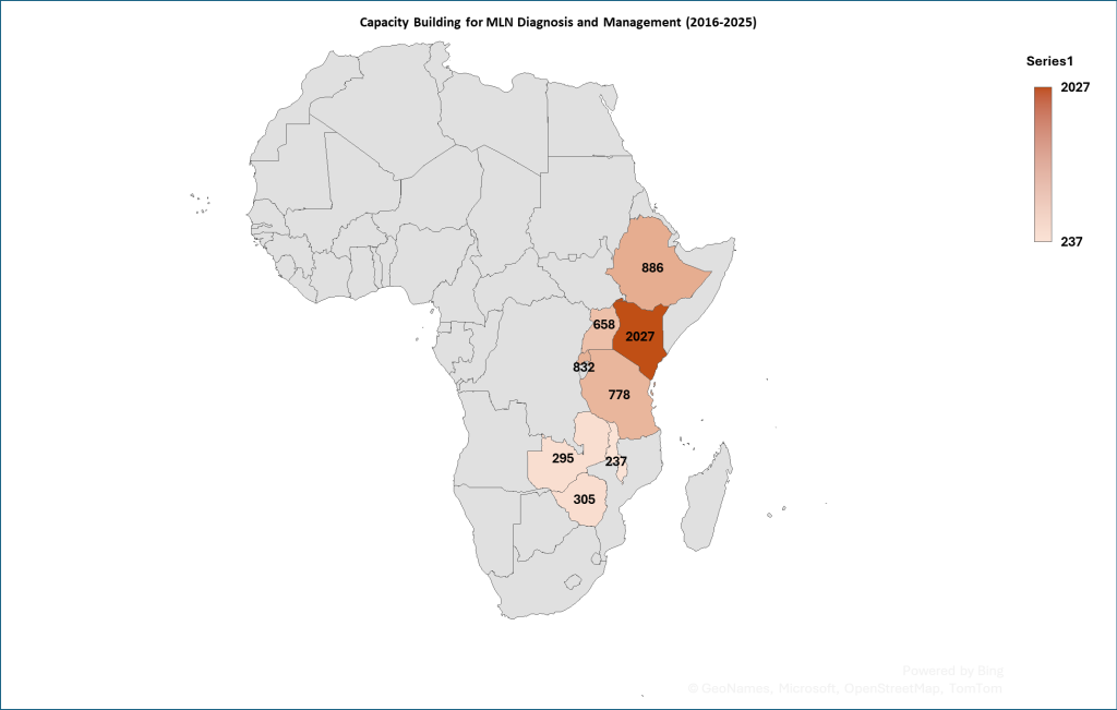 More than 5,000 extension workers, seed company staff, growers, and NARES partners were trained in MLN-free seed production, surveillance, rogueing, and phytosanitary compliance.